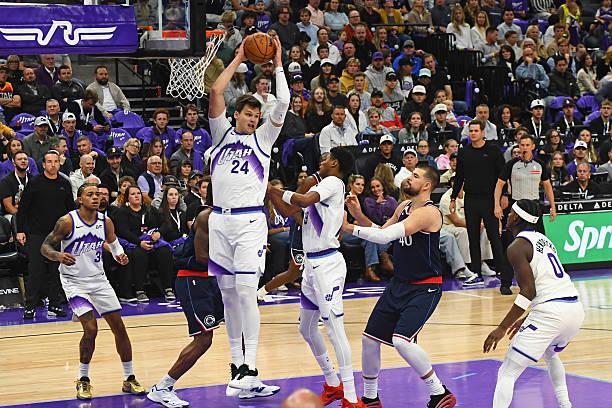 本场比赛中,爵士的先发中锋沃克-凯斯勒(Walker Kessler)的表现算得上是令人刮目相看。凯斯勒全场出场28分40秒,投篮7中7,三分线外2中2,罚球8中6,以运动战100%的命中率得到了全场最高分22分外加9篮板4助攻2抢断4盖帽的全面数据,还有1次失误和5次犯规,正负值为+13。凯斯勒在进攻端展现出了全面的得分能力,他不仅有着出色的篮下得分能力和进攻效率,他在外线投篮方面的稳定性也令人眼前一亮,而且他还展现出了一定的传球能力和策应能力。除此之外,凯斯勒在防守端也是有着超强的护框能力和内线防守能力,他在篮板保护方面也同样能够起到关键的效果。凯斯勒在本场比赛中的表现远远不只是一名普普通通的蓝领型中锋,他简直是打出了顶级蓝领型中锋的水准。