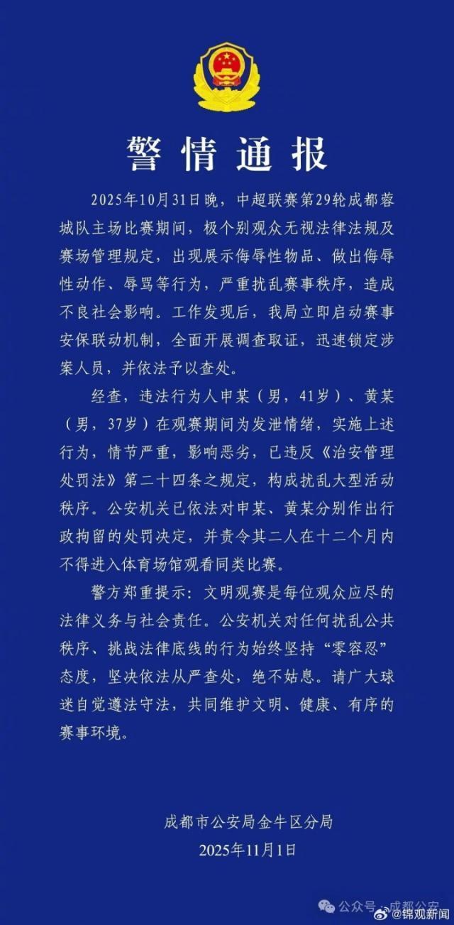 11月01日讯 成都市公安局金牛区分局通报,2名球迷观战蓉城vs河南时,出现展示侮辱性物品、做出侮辱性动作、辱骂等行为,已被行政拘留。